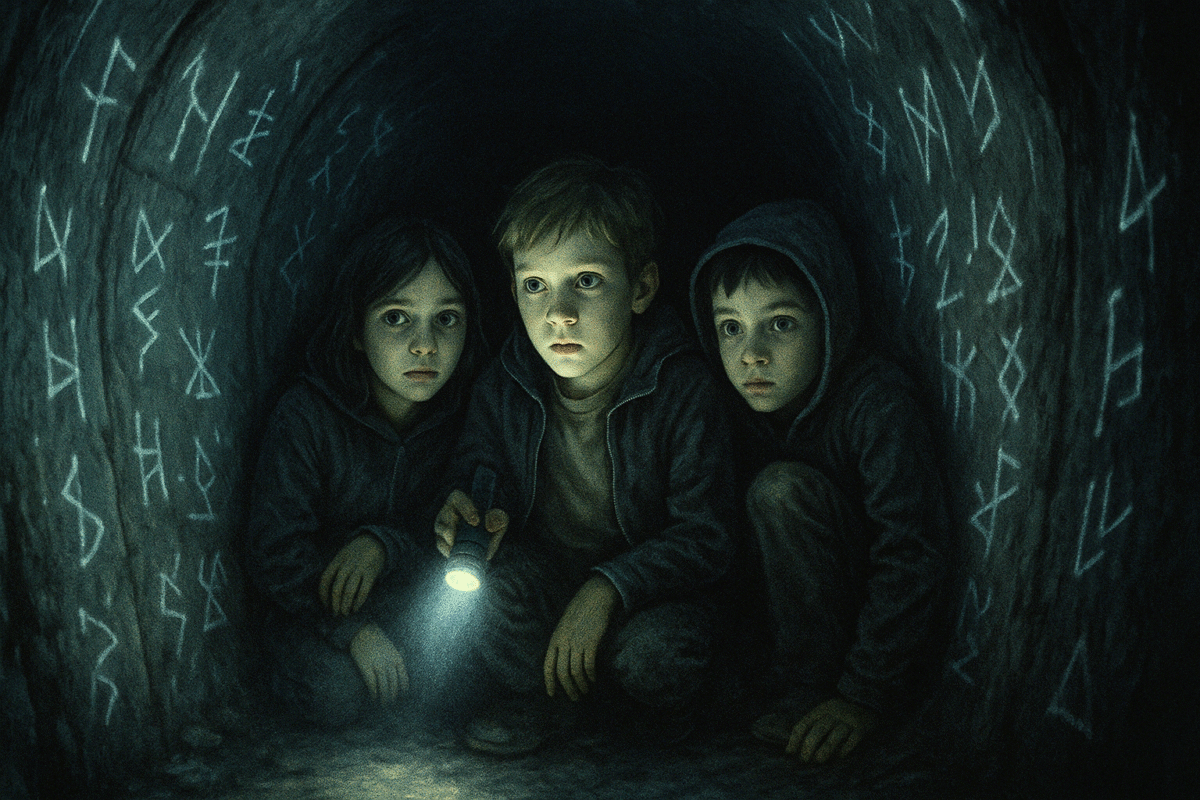 তিন বন্ধু **বাড়ির পিছনের জঙ্গলে** দৌড়ায়। কিন্তু **একটি গর্তে পিয়াল পড়ে যায়**! নিচে সে **একটি সুড়ঙ্গ** খুঁজে পায়, যার গায়ে লেখা: *”নীল অমৃতের গোপন কারখানা →”*